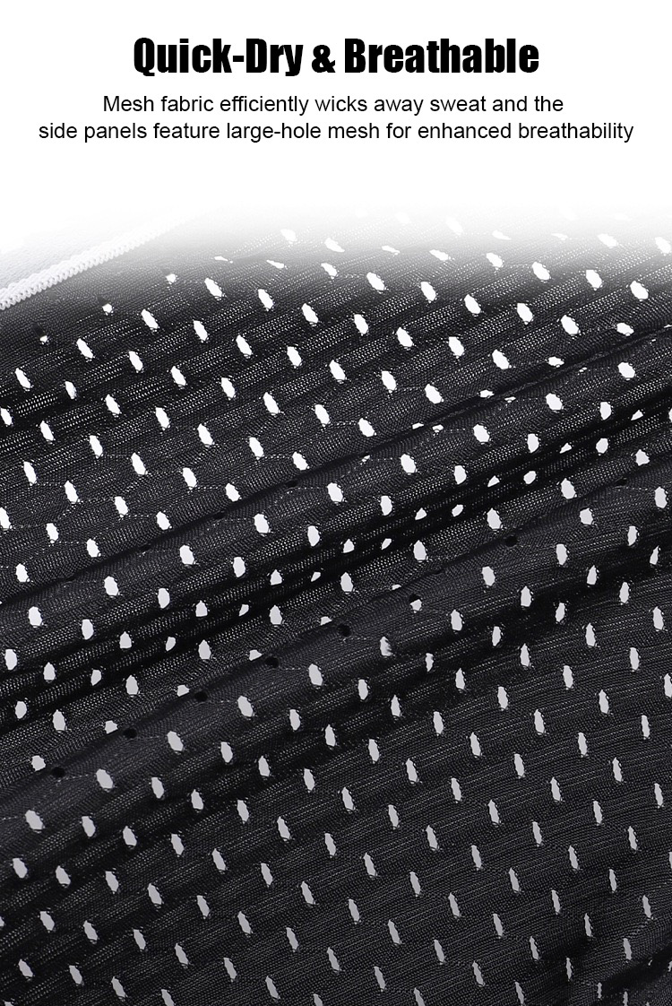 Fabric: Premium sweat-wicking Polyester/Spandex mesh blend.