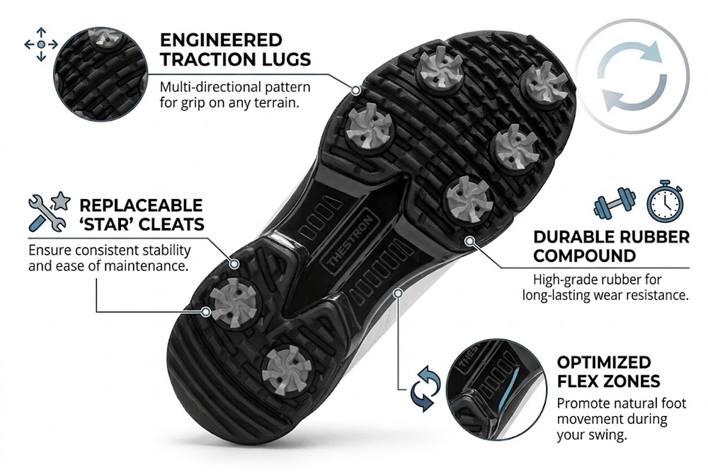 Maximum Traction Rubber Outsole: Engineered for the "ground game," the rugged rubber outsole features strategically placed traction lugs and secondary spikes. Whether you’re on a dewy morning fairway or a slippery slope, you’ll maintain a locked-in grip.